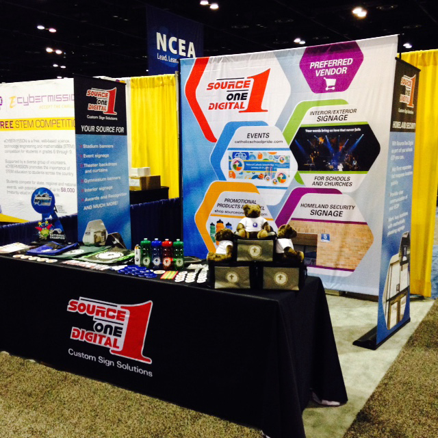 At Source One Digital you’re not limited to a logo imprinted on a dozen fabric colors. Instead, you can print the entire surface with full-color photographic images or any color imaginable. Our premium table covers are printed direct to fabric so the color is embedded right into the fibers of the material. Our process provides a long lasting table cover that is wrinkle-resistant and easy to care for.